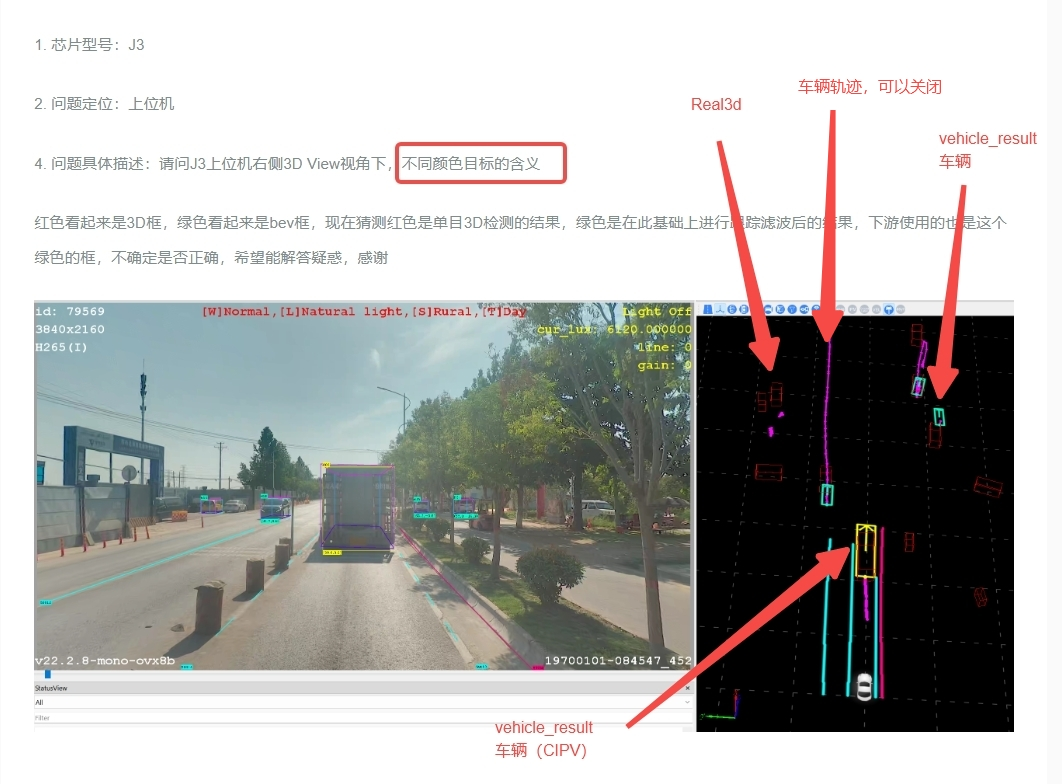 4. 问题具体描述:请问J3上位机右侧3D View视角下,不同颜色目标的含义