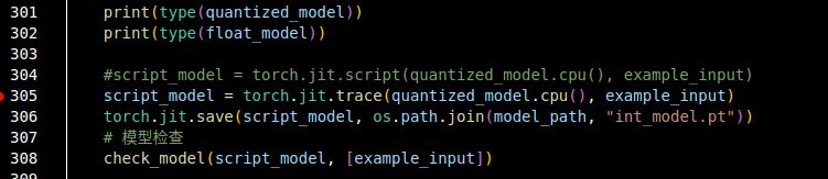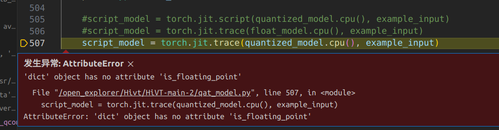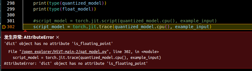 我们在根据算法工具链量化模型,模型部署部分的第一步,模型检查部分,我们已经将模型的传入参数变成了tensor,但是在torch.jit.trace报错,报错如下: