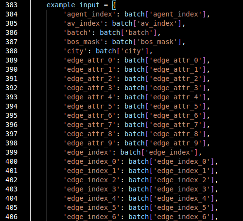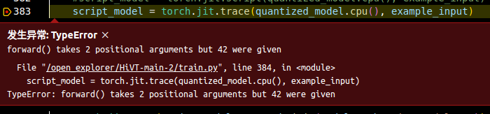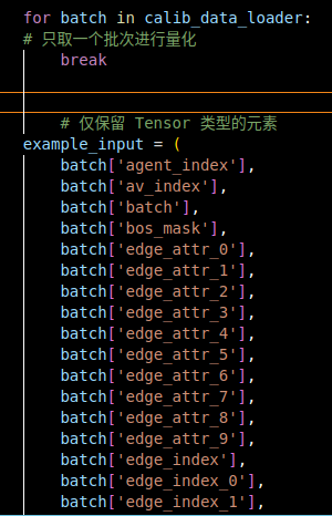 你好,我将batch里面的每个数据作为单独输入之后,出现了两个问题:1、torch.jit.trace函数期望模型的 forward 方法接受一个单一的输入参数,example_input 包含了多个参数?2、模型的 forward 方法应该能够处理 example_input 作为一个整体,而不是将每个参数分开处理?请问上面两个问题该如何解决呢?下面是我修改后的代码:报错如下: