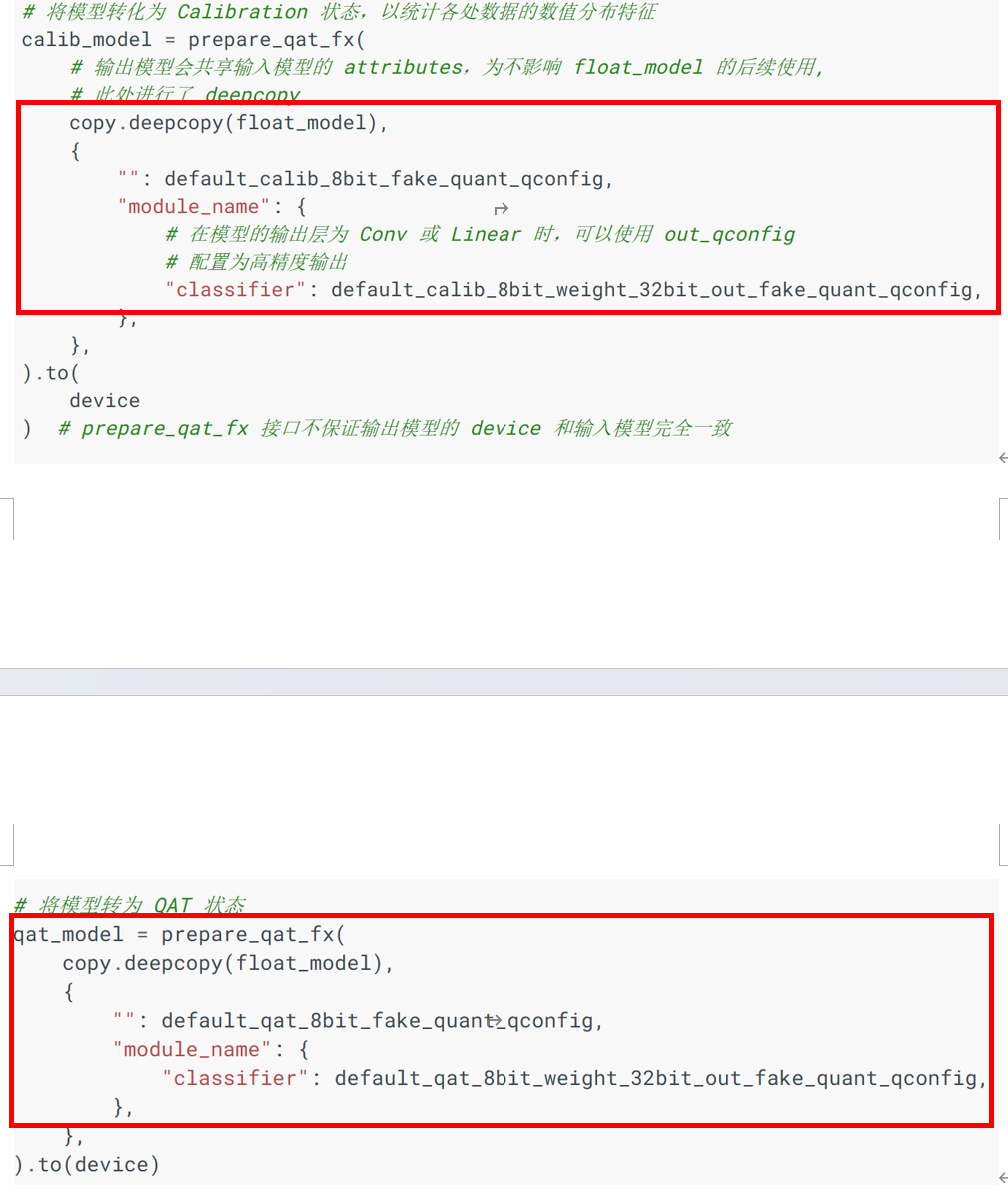 对这部分的代码进行一下说明吧,有了下面的说明,你应该就知道了:copy.deepcopy(float_model): prepare_qat_fx内部对于模型参数的使用类似于C++中的指针引用,对模型是就地修改的,为了不影响引用的float_model,对模型进行了深度拷贝。下面的部分是量化配置信息,如下为注释部分:自己的模型,如果输出部分是conv或linear, 可以按照上面这个这设置,如果不是,使用常规的 {"": get_default_qat_qconfig()}就OK