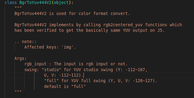 转YUV,基本都用了BgrToYuv444或者ToTensor(to_yuv=True,use_yuv_v2=False),对应的Normalize参数是mean=128.0,std=128.0