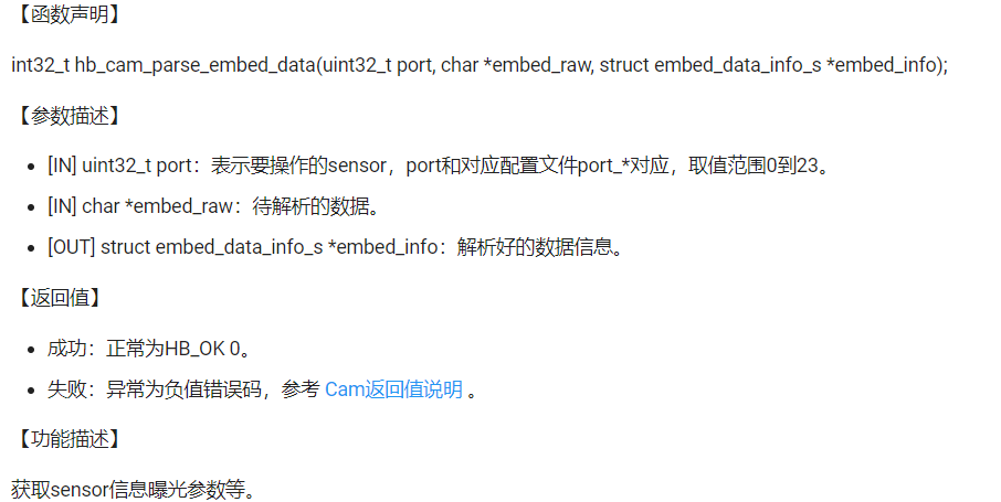 您好: J6支持emb data的数据接入与处理,其中接入部分需要相应配置sensor输出也serdes配置,处理部分需要sensor驱动库中实现一个 .parse_embed_data 功能函数,做自定义解析,之后可使用hb_cam_parse_embed_data()接口进行解析处理。 相关文档后面将陆续完善释放。
