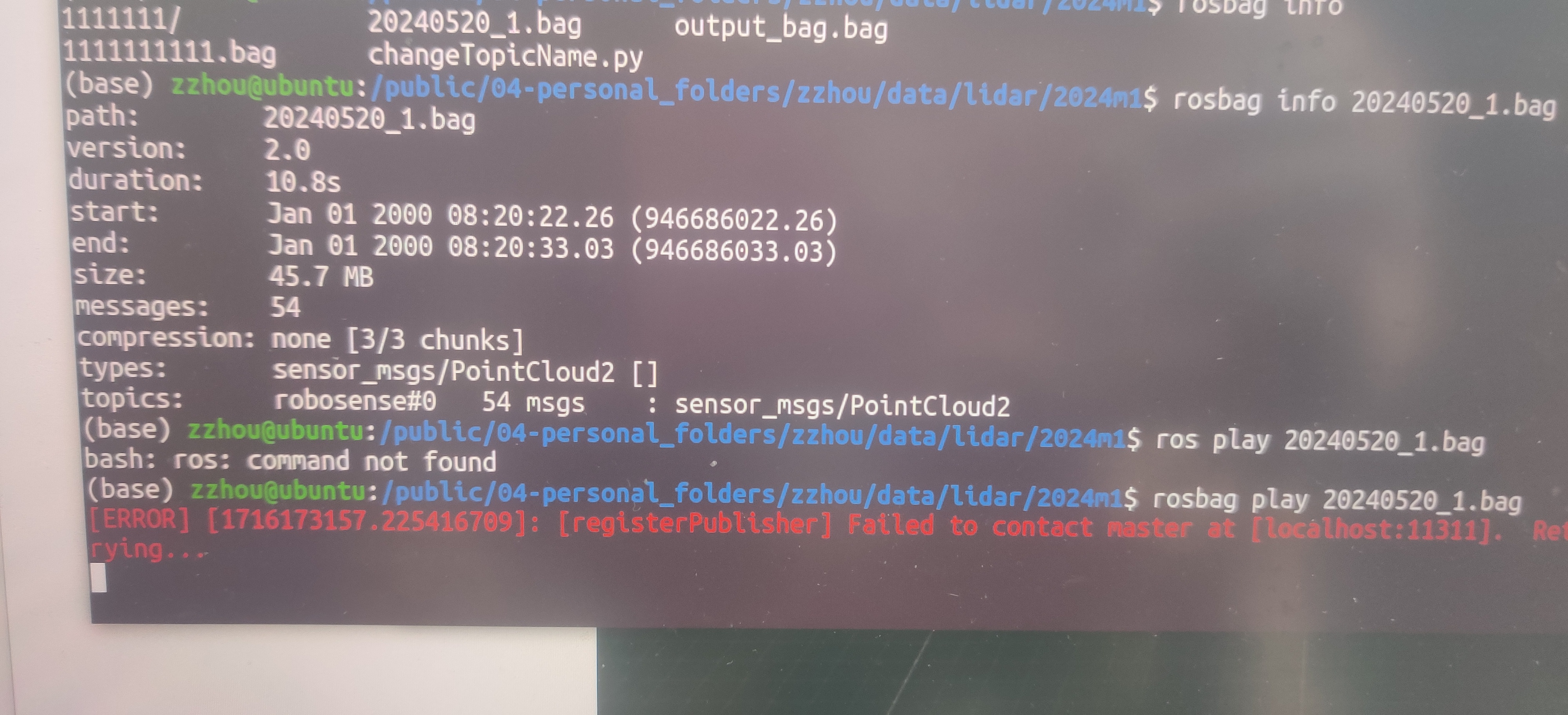 ps:以上所有命令和脚本我均在先前用ros录制的bag文件上试了,均可以成功,所以可以基本排除是命令行和脚本本身的问题。