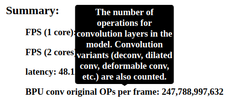 4. 问题具体描述:当前的hbm编译后会生成一个模型一些开销的统计的页面,在统计OP数时只统计了所有Conv类的OP数。当前地平线是否提供了工具去统计模型整体的OP数?