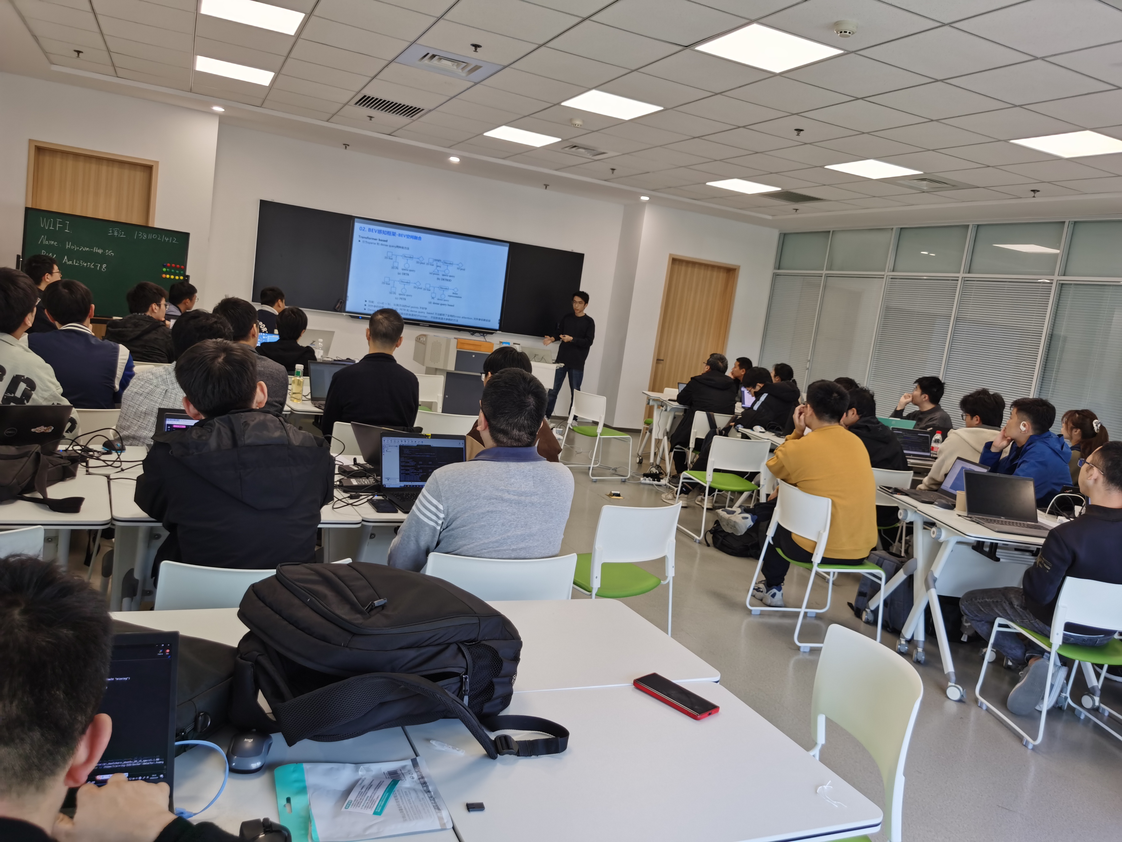 在理论介绍部分,来自地平线的算法工程师从自动驾驶感知技术发展历程出发,介绍了BEV感知框架的由来、技术细节、应用及未来发展方向,并详细介绍了其中涉及到的Transformer及Occupancy相关算法模型。在此基础上,进一步介绍了面向上述框架及模型的相关数据制备、标注、仿真及测试等基础知识,并最终介绍了上述技术在端到端自动驾驶框架中的应用前景。现场教学气氛热烈,学员们认真听讲,并不时与老师沟通,有效夯实了算法基础。
