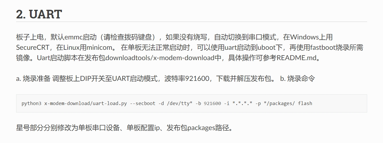 - 尝试过的几种配置:1)板卡左侧拨码开关[4:2]配置为010,也即UART XMODEM模式,用hbupdate工具通过COM5,COM6,COM7,COM8接口烧写均失败 2)板卡左侧拨码开关[4:2]配置为000,也即EMMC模式,用hbupdate工具通过COM5,COM6,COM7,COM8接口烧写均失败。