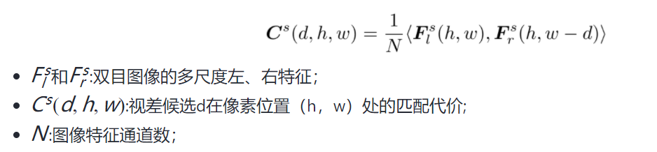 cost volume用于在双目匹配中衡量左右图像像素匹配的程度,StereoNetPlus通过计算左右视图的相关性来构建cost volume,计算公式如下: