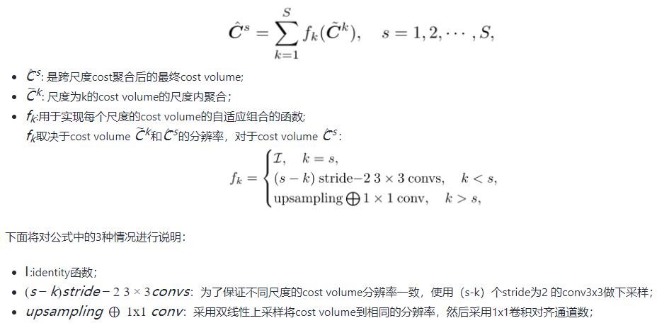 双目图像进行下采样后,在相同的patch尺寸下,纹理信息将更具鉴别性,所以跨尺度成本聚合算法中引入了多尺度交互。最终的cost volume是通过对不同尺度的成本聚合结果进行自适应组合得到的,公式如下: