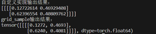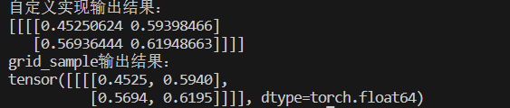基于上面的思路,可以进行一个简单的自定义实现。根据指定shape生成input和grid,之后取grid中的第一个位置中的x,y,根据x,y从input中通过双线性插值计算出output第一个位置的值。类比使用pytorch中的grid_sample算子生成output。