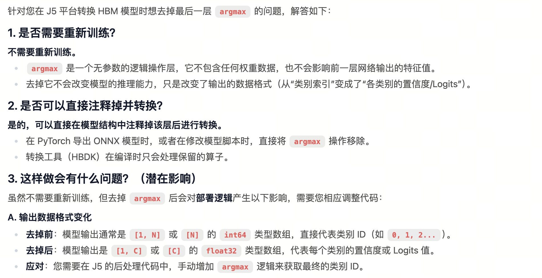 请问下1-j5平台,我在转hbm的时候我想去掉最后一层argmax,需要重新训练吗,还是只是把这一层直接注释掉就可以直接转呢?这样会不会有问题呢?