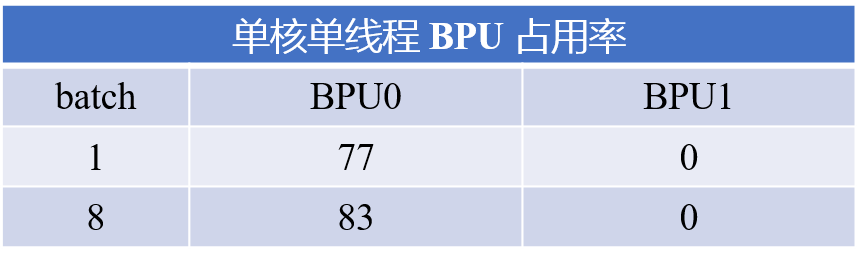 使用hrt_model_exec工具的perf功能,以单核单线程方式运行,并使用hrut_bpuprofile -b 2 -r 0指令查看BPU占用率。可以看到在batch=8的情况下,单核BPU占用率相比batch=1有明显提升。