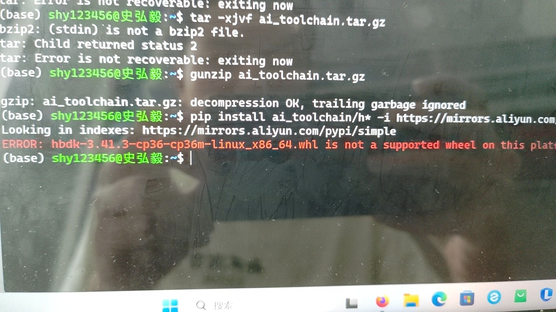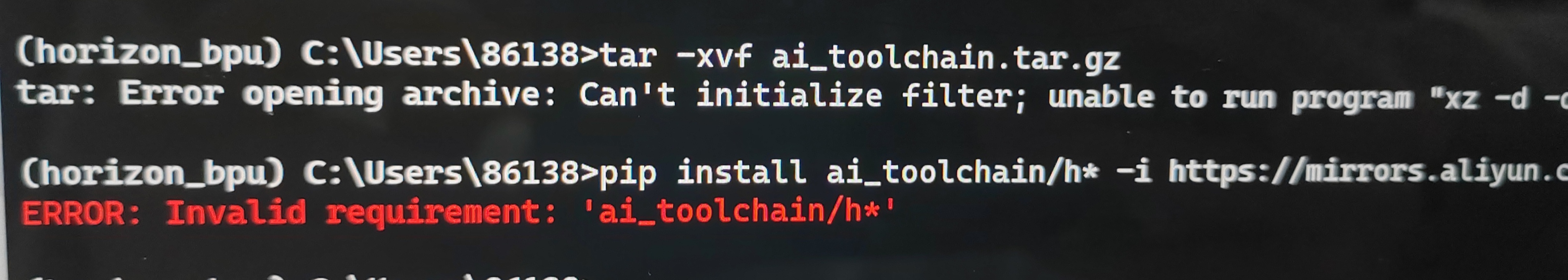 工作人员您好!我目前正在按照x3派工具链安装指南在自己的电脑上尝试操作,但是在进行到解压缩操作和在阿里镜像源上下载相关软件时出现了问题,并且tar -xvf yolov5s_v2.0.tar.gz和pip install pycocotools -i https://mirrors.aliyun.com/pypi/simple可以正常运行,但是涉及到aitoolchain的这两句:tar -xvf ai_toolchain.tar.gz和pip install ai_toolchain/h* -i https://mirrors.aliyun.com/pypi/simple却异常报错,更换解压命令后,解压缩似乎成功了,但报出的语句不像是正常解压成功,即时如此,