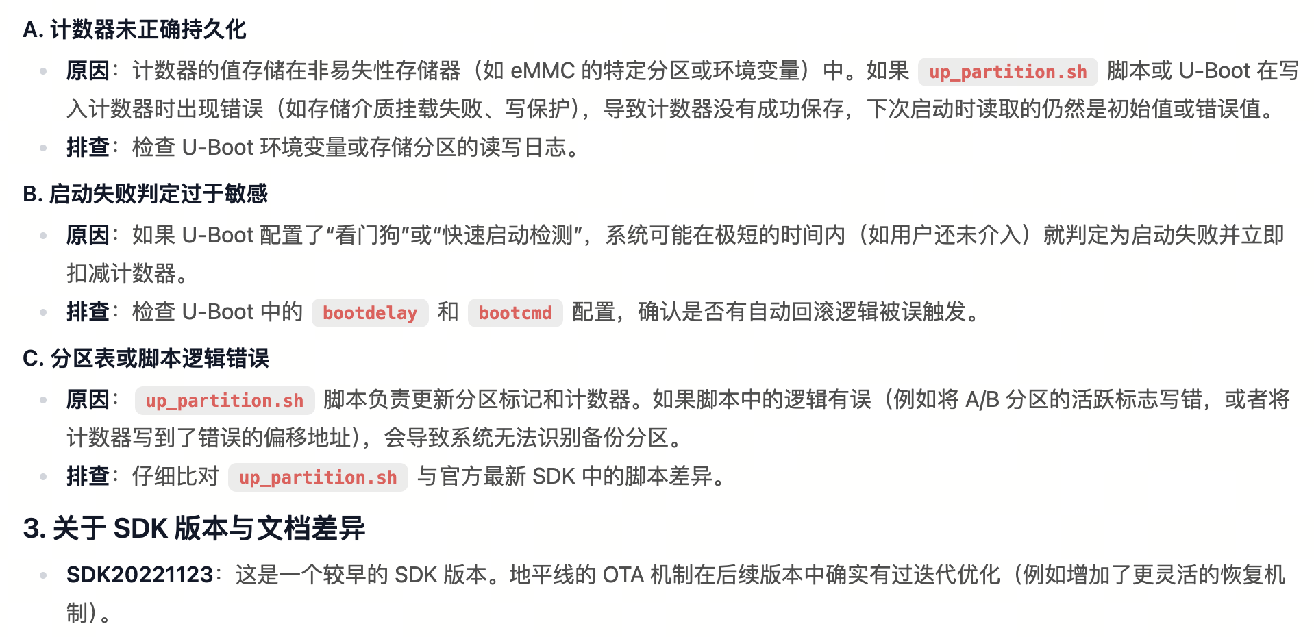 参考《地平线系统软件 OTA 参考实现原理和使用方法》3.0版本,实现OTA功能,该文档中描述启动限制次数为25次,如果超出上述次数启动失败,我们在实际使用中发现,启动次数只有一次,启动失败之后也无法重新启动备份分区或进入recovery分区。详细阅读SDK中UBoot代码及up_partition.sh等脚本文件发现,在脚本中实际是将count设置成23,而非文档中描述的置0。想咨询一下,SDK的实现与文档有差异,是否OTA的实现机制有更新或者OTA版本不是最终版本?