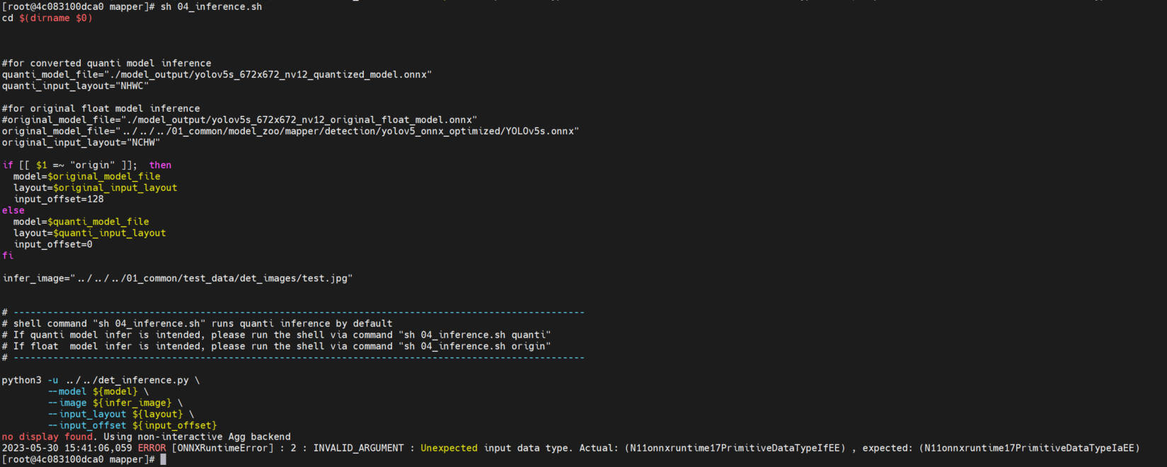 我是也考虑过是输入数据问题,但用官方的示例也报同样的错,今天我又分别试了官方的yolov3和fcos,都在执行04的时候报了同样的错,以前我这个环境一直都是正常的。请您帮忙想一下环境中是否有哪些参数的设置会导致这样的报错呢,我也在看一下