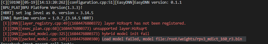问题描述:我在工具链中模型通过check,并且生成.bin文件了,但是上版测试的时候出现unsupported layer:HzRsqrt ,Load model failed, model file:/root/weights/rpv3_mdict_160_r3.bin 。现象如下