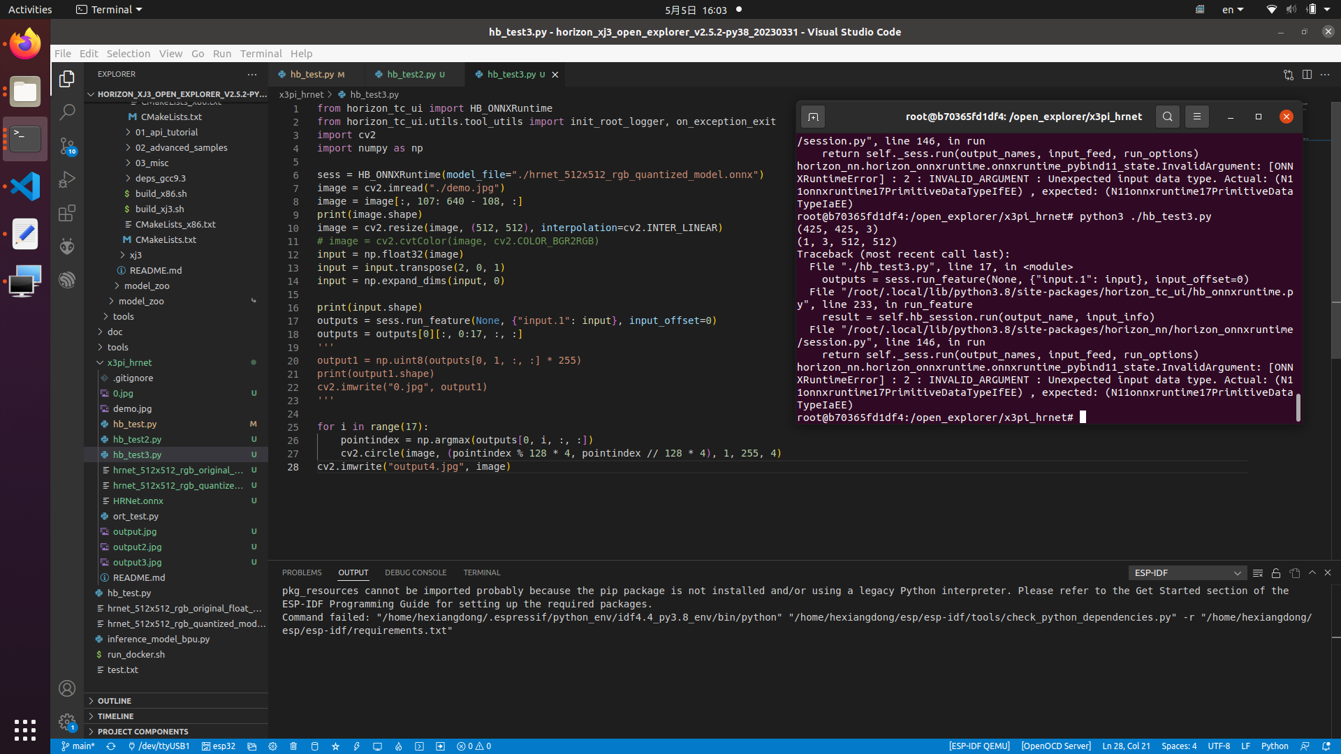 无法测试量化生成的ONNX模型。在文末的链接中包含测试用的代码和ONNX文件,其中ort_test.py使用公版ONNX Runtime进行测试,hb_test1.py使用HB_ONNXRuntime测试转换前的模型,hb_test2.py使用HB_ONNXRuntime测试转换后的original_float模型,这三者的输出结果均正常。在hb_test3.py中试图使用HB_ONNXRuntime测试转换后的量化模型,报错:horizon_nn.horizon_onnxruntime.onnxruntime_pybind11_state.InvalidArgument: [ONNXRuntimeError] : 2 : INVALID_ARGUMENT : Unexpected input data type. Actual: (N11onnxruntime17PrimitiveDataTypeIfEE) , expected: (N11onnxruntime17PrimitiveDataTypeIaEE)