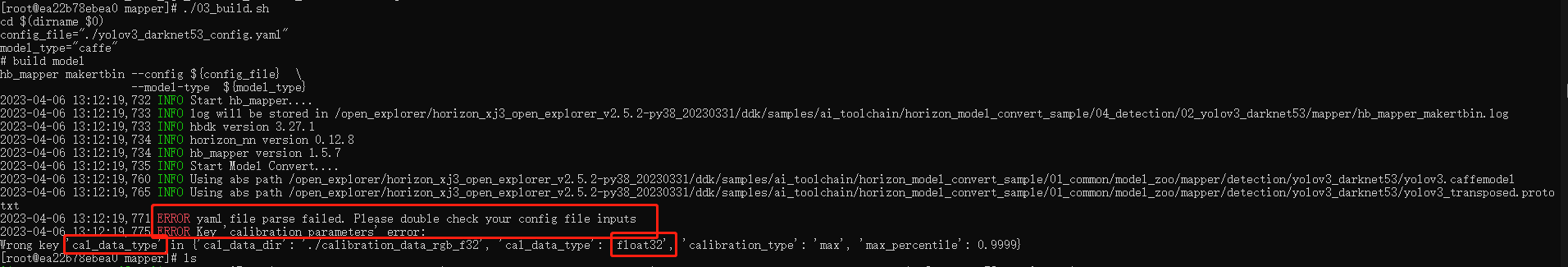 问题描述: 运行(/horizon_xj3_open_explorer_v2.5.2-py38_20230331/ddk/samples/ai_toolchain/horizon_model_convert_sample/04_detection/02_yolov3_darknet53/mapper)路径下的官方脚本,01_check.sh和02_preprocess.sh运行没有问题,但运行03_build.sh会出现如下错误
