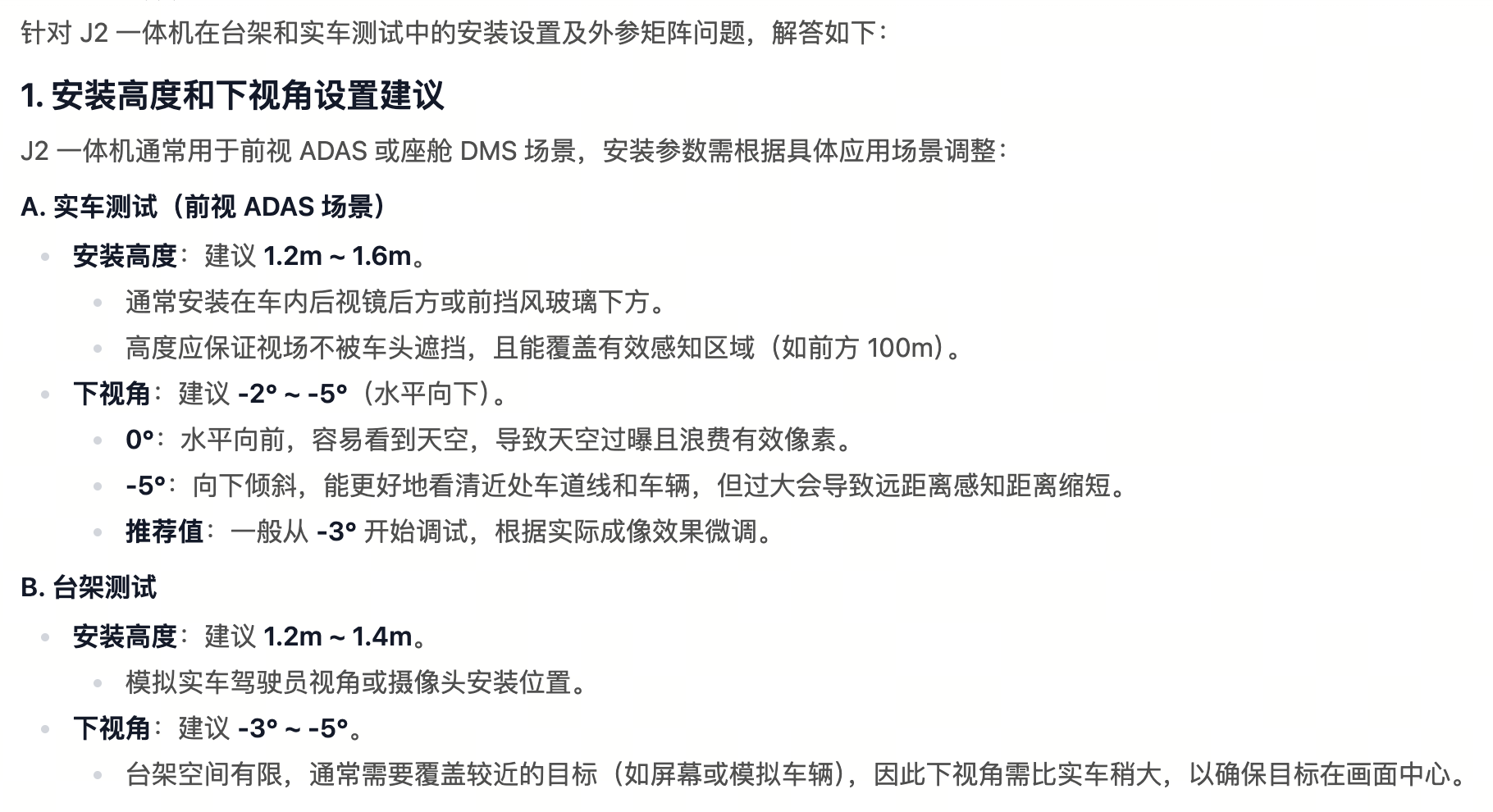 你好,我们想要把J2一体机放在台架和实车上进行测试,请问J2一体机的安装高度和下视角需要怎么设置?J2一体机镜像中的Camera的外参矩阵默认是多少?