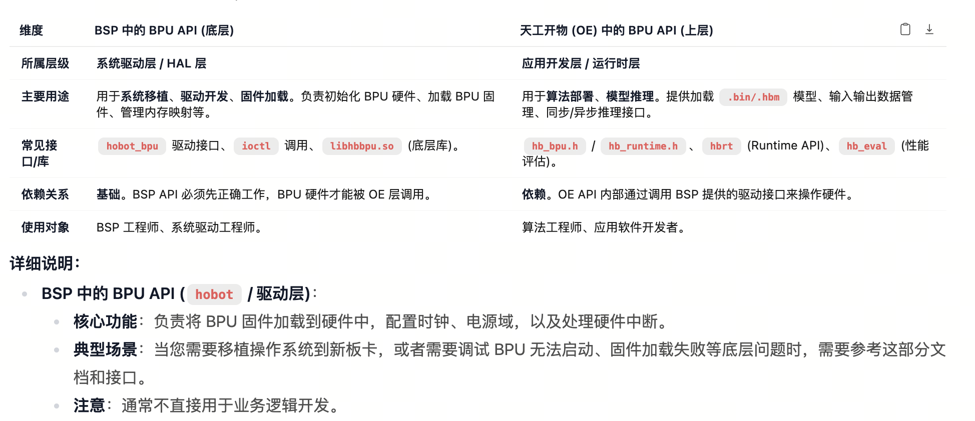 我想问问bsp中有与bpu相关的文档嘛,包括hbdk,hobot?bsp中关于bpu的api与天工开物中bpu的api各有什么用处?区别是什么。谢谢