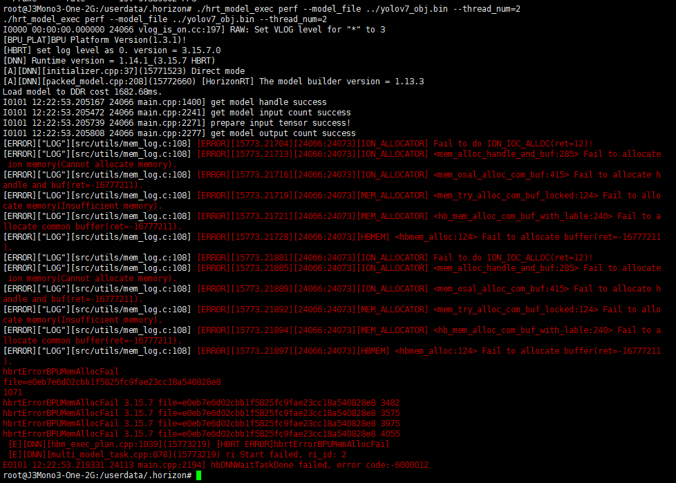 使用hrt_model_execperf工具,分别用默认单线程和多线程进行推理,结果如下图。J3使用单线程推理耗时长,使用多线程推理失败。