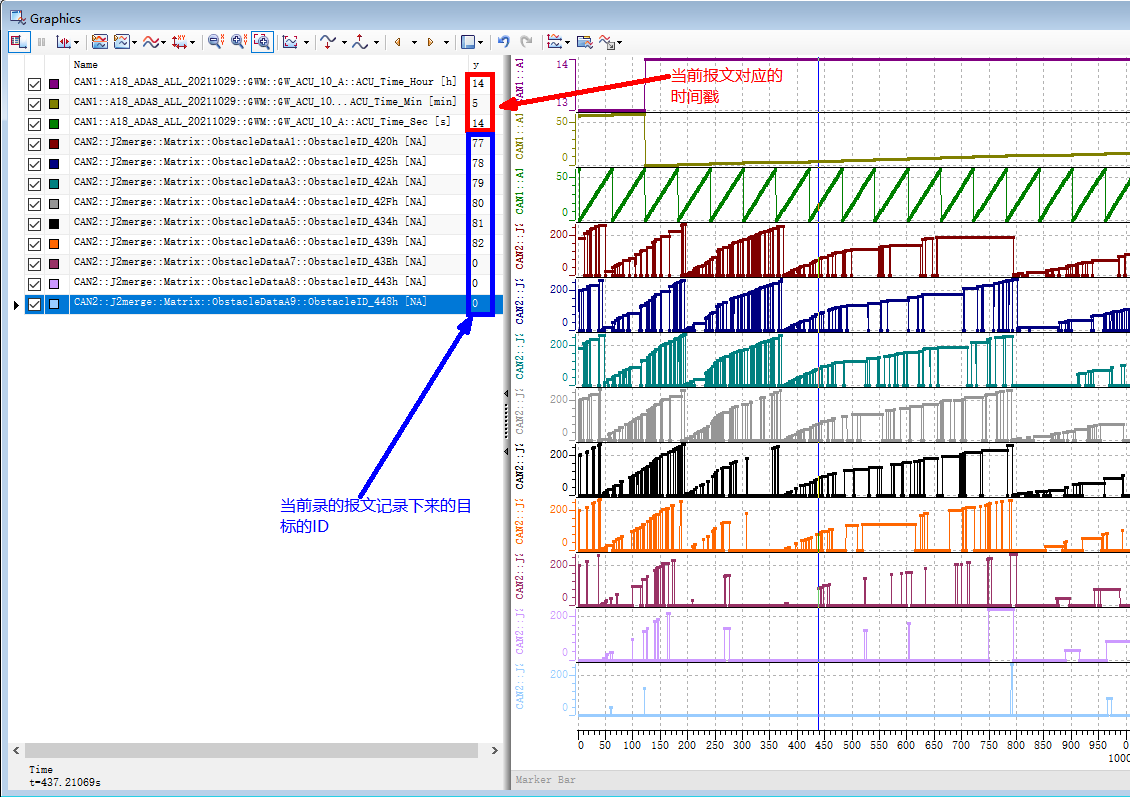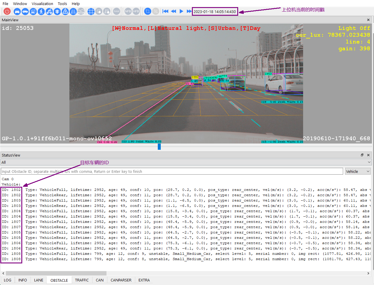 根据上位机的时间戳和CANOE录制的报文时间戳可知当前的上位机和CANOE录制的报文处于同一时刻,但是CANOE界面显示的Obstacle ID和上位机上显示的目标ID是对应不上的,就算使用上面的计算方式,也对应不上。