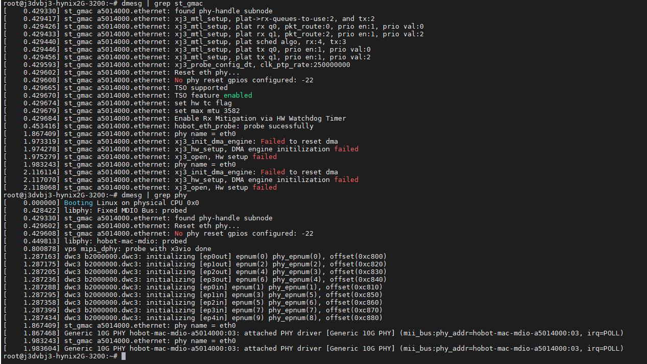 您好:出现”Failed to reset dma“ 一般有以下三点方向可供排查:检查RX_CLK是否正常提供,即测量PHY或switch提供给J5的时钟是否正常,以及提供的时钟和J3 MAC复位是否有时间差。检查J3 提供电压是否匹配,包括PHY tx_clk电压,PMIC提供电压是否正确检查PMIC提供这路电压对应电流是否异常。但结合您这边还显示”no phy reset gpios configured“ ,怀疑phy的复位是否正常,建议用示波器量一下phy的复位是否正常释放,以及前面三点是否正常。