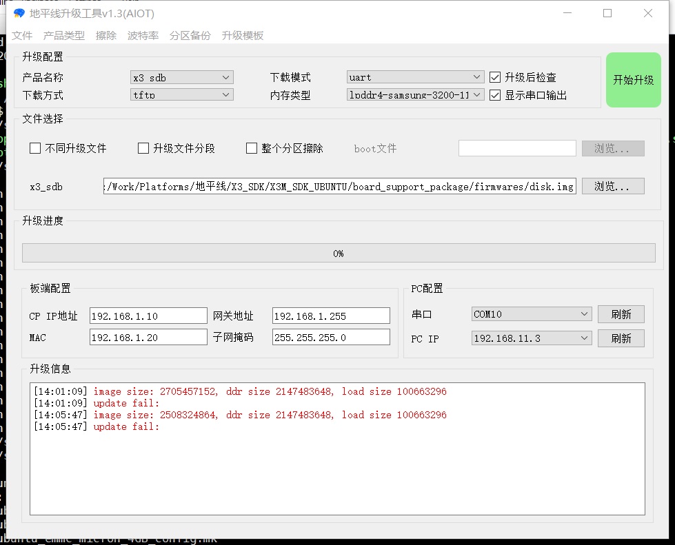 使用地平线升级工具v1.3(AIOT) uart方式升级失败,出错信息为image size太大,工具配置截图如下: