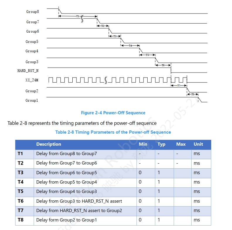 如下表格中所示,GROUP8,GROUP7 T1,T2的 min,typ,max都未定义。上电的时候可以最先上group8,group7吗?下电的时候可以最后下group8,group7吗?还是需要按照图中所示,group8 最后上,最先下?