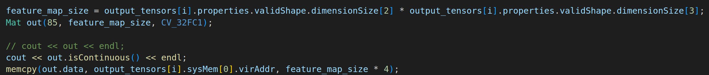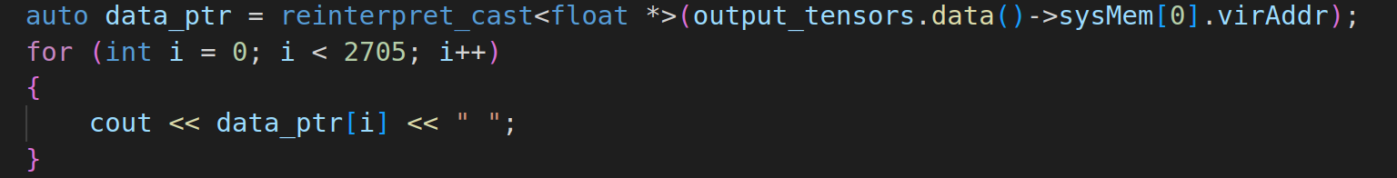 output_tensors[0]的输出尺寸是1x85x52x52,我输出了其前2705(52*52+1)个值,同时输出了拷贝后的out的前2705个值,发现out的第2705个值并没有被拷贝过来,