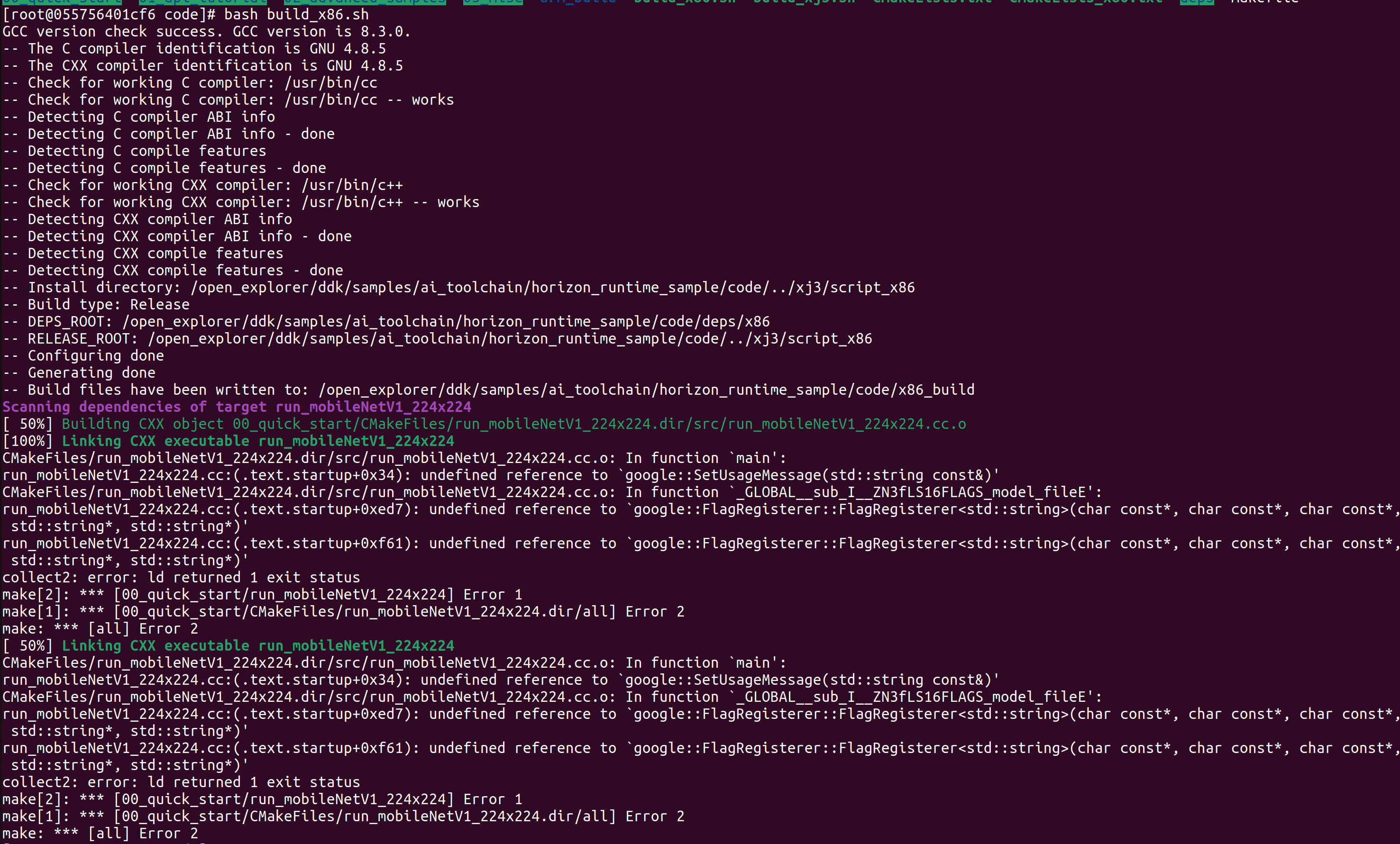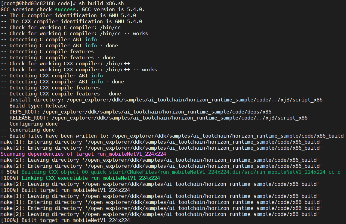 您好,看到您编译的应该是ddk/samples/ai_toolchain/horizon_runtime_sample/code/下的build_x86.sh文件,我这边在open_explorer_v1.13.3中编译成功,如下图所示。