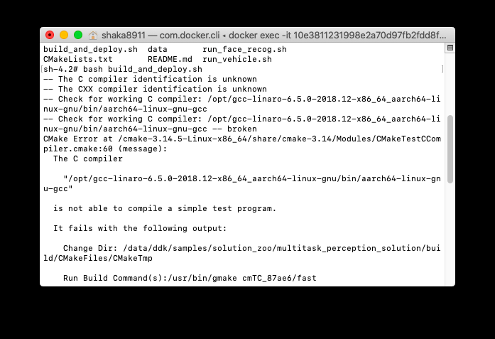 下载的最新的1.3.9包里的docker镜像,运行multitask_perception_solution里的build_and_deploy.sh。错误如下。docker里需要改哪些参数配置?我自己写helloworld,本地gcc编译没有问题,修改cmakelist后就也会报下图的错误。请问怎么解决。
