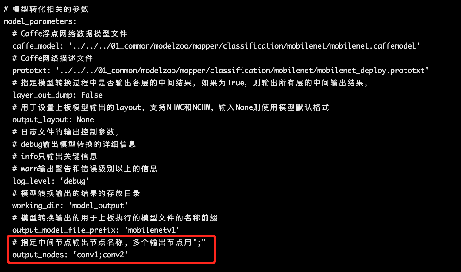 在yaml的model_parameters配置单元,通过output_nodes参数来新增一个输出节点。