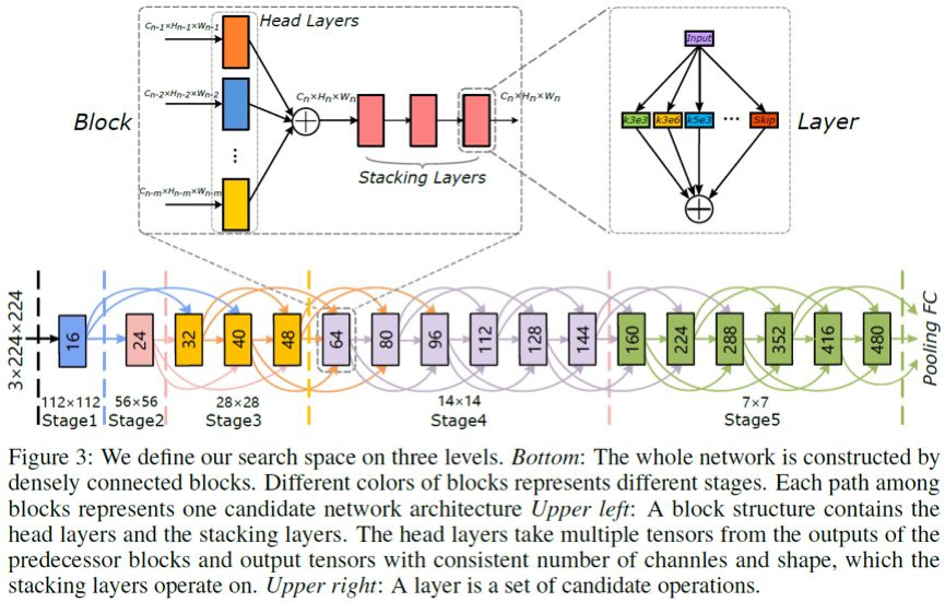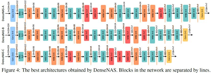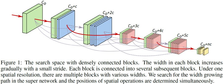 最近 Differentiable NAS 通过在连续空间上构建一个包含所有要搜索结构的搜索空间(super network)极大的减少了搜索代价,但事实上,很少有 Differentiable 的方法可以搜索网络结构的宽度(即通道数),因为按照传统 Differentiable NAS的方法,将不同宽度的结构集成到一个 super network 里面很难实现。在本论文中,我们提出了一个新颖的 DifferentiableNAS 的方法 —— DenseNAS,该方法可以搜索网络结构中每个 block 的宽度和对应的空间分辨率。我们通过构建一个密集连接的搜索空间来实现该目的。