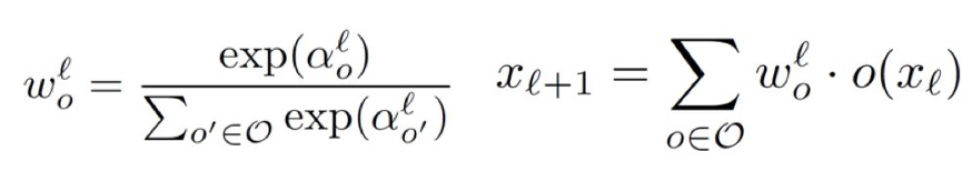 对于 layer 层次,每个候选操作被赋予一个结构参数,layer 的输出由所有候选操作输出的加权和得到: