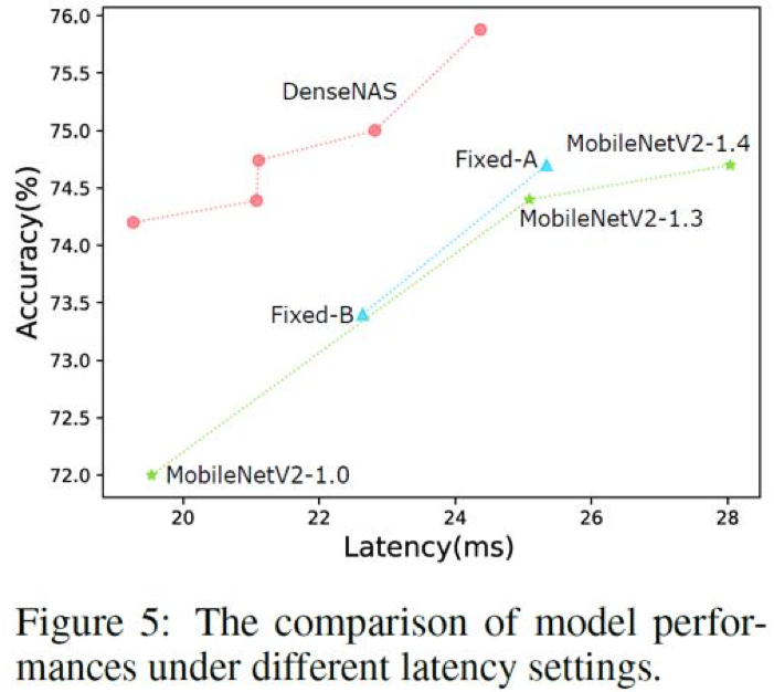 DenseNAS 进一步在不同程度 latency 优化下搜索模型,在各个 latency 设定和需求下,都能得到性能优越的模型结构,均要远好于固定宽度/block 搜索和人工设计的模型。
