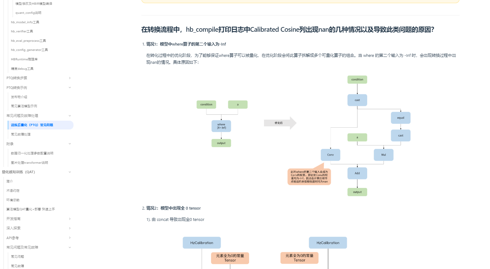 请问文档里(下面3张图贴了)PTQ常见问题有“ 在转换流程中,hb_compile打印日志中Calibrated Cosine列出现nan的几种情况以及导致此类问题的原因?”,里面说 模型中出现全 0 tensor 会导致。