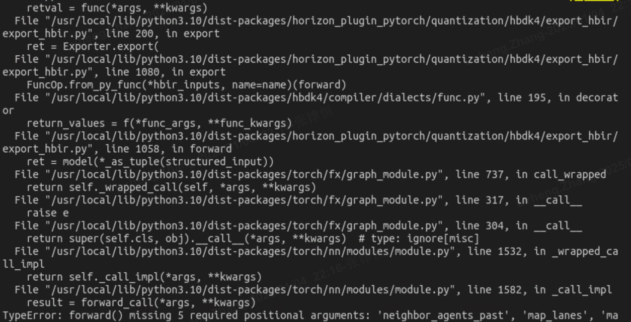 我在使用自己的模型做QAT的导出qat.bc和定点bc模型时,仿照bevformer例程中的导出脚本export_hbir.py,构造伪输入数据并调用hbdk4.export进行模型导出,但是会报错,看起来是显示输入数据不匹配,报错: