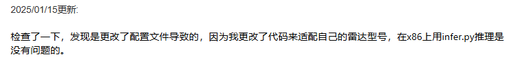 检查了一下,发现是更改了配置文件导致的,因为我更改了代码来适配自己的雷达型号,在x86上用infer.py推理是没有问题的。