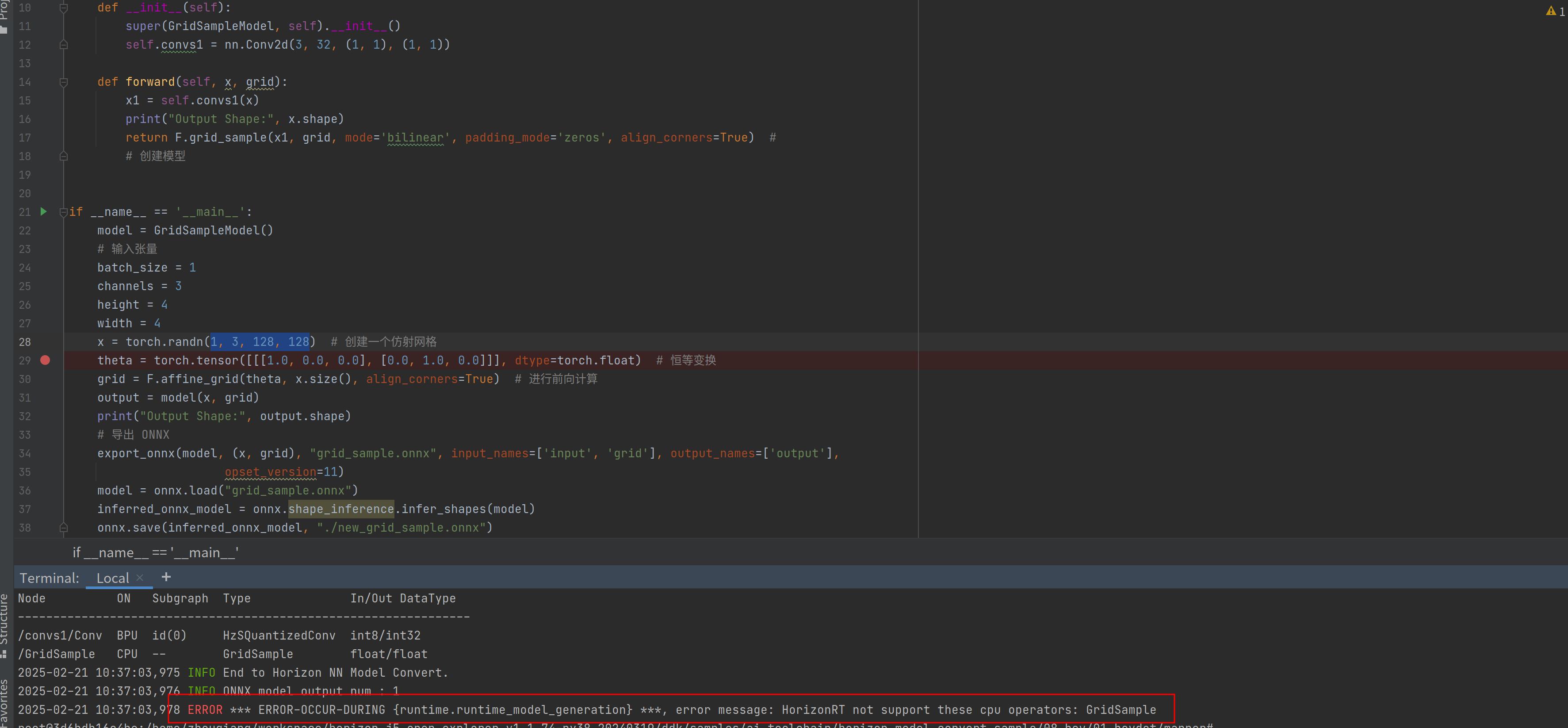 /convs1/Conv BPU id(0) HzSQuantizedConv int8/int32 /GridSample CPU -- GridSample float/float 2025-02-21 10:37:03,975 INFO End to Horizon NN Model Convert. 2025-02-21 10:37:03,976 INFO ONNX model output num : 1 2025-02-21 10:37:03,978 ERROR *** ERROR-OCCUR-DURING {runtime.runtime_model_generation} ***, error message: HorizonRT not support these cpu operators: GridSample