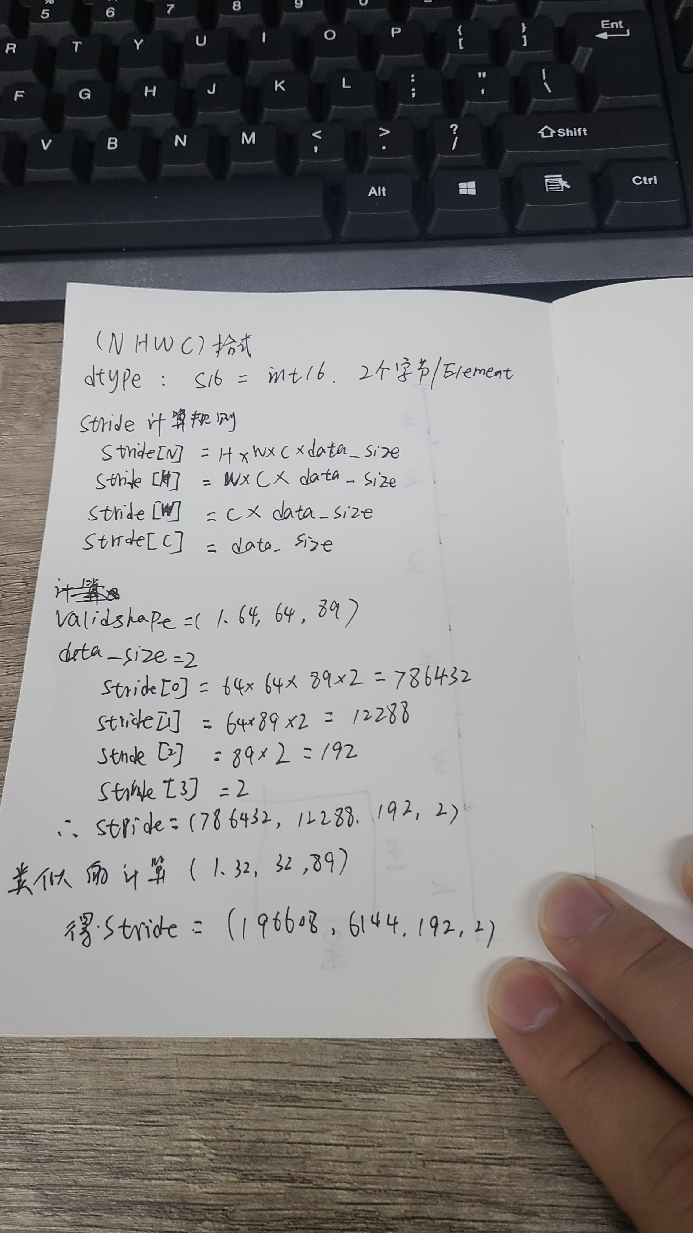 上面的意思是指数据类型为S16,因此从内存上看,每个元素占用的内存空间为2字节,对应stride的最后一个维度stride[3]为2,表示在shape层面最后一维中的89,相邻元素的内存地址间隔为2;