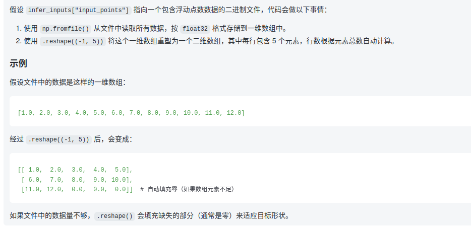 报错代码:points = np.fromfile( infer_inputs["input_points"], dtype=np.float32 ).reshape((-1, 5))reshape对于数据量不够时,是否会填充缺失的部分(通常是零)来适应目标形状呢?如果是的话,就不应该报错了吧?