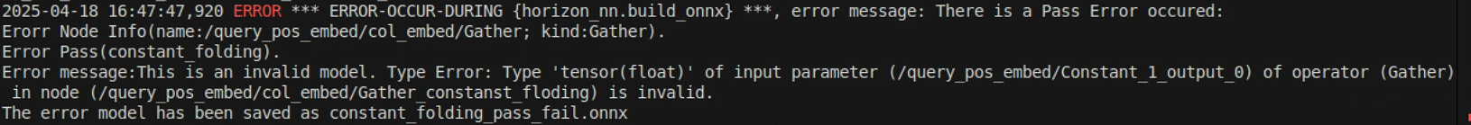 您好,我用qat示例的tools/export_onnx.py导出bev_cft的onnx模型,然后想在ptq流程下通过设置load模式得到bin文件。但是在hb_mapper checker和hb_mapper makertbin时出现如图所示报错,请问是算子不支持吗?