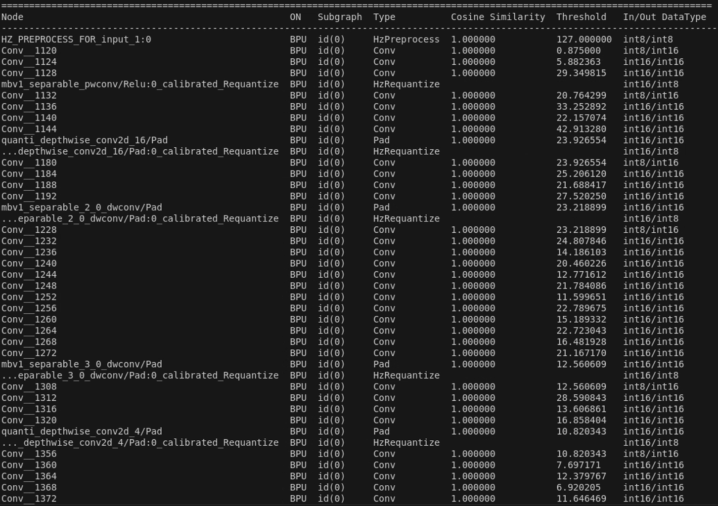您好,我在PTQ量化过程中的yaml文件内将unet模型的部分卷积算子输入输出从int8改为int16,更改前后模型算子信息如图所示。但是通过hb_perf得到的html文件查看模型计算量发现修改前后未改变,请问是因为这样操作并未影响到算子本身权重的数据精度吗?如果我想改变量化后模型中算子本身的权重数据精度,应该如何操作?