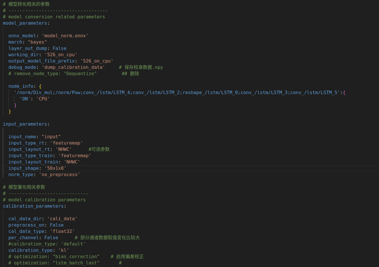 3.问题描述:lstm模型进行分类,训练后转换为onnx模型,检测精度为0.91,使用PTQ量化后,精度下降严重,量化后quantilized_model.onnx和calibrated_model.onnx检测精度相似,为0.52,original_float_model.onnx与optimized_float_model.onnx检测精度为0.91。通过精度debug工具,查看,发现部分激活节点相似度较低,node中也存在相似度低的节点。修改模型转换yaml文件中calibration_parameters:optimization:“lstm_batch_last”不起作用、打开per_channel也无效果。最后将量化比较敏感的算子运行在CPU上,出现报错,如何解除激活节点量化敏感的节点的量化?请指导一下。