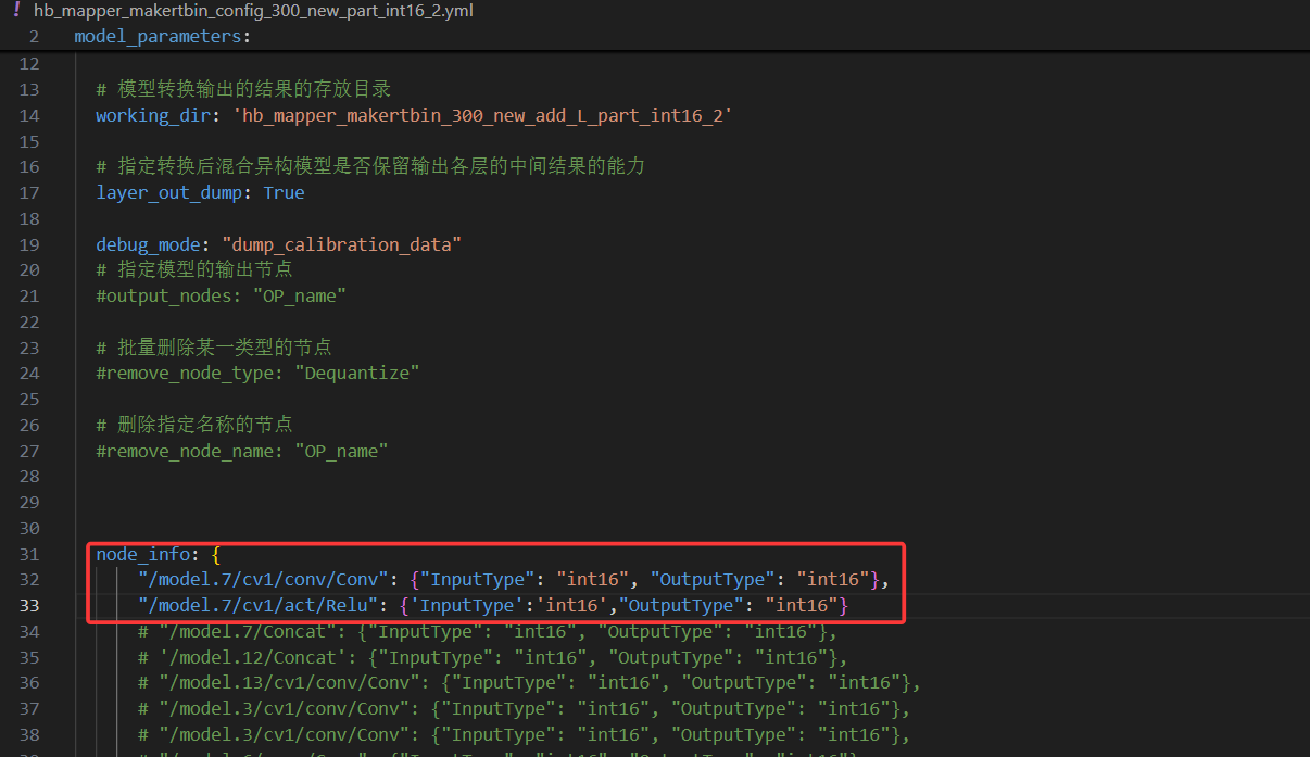 尝试更改量化编译配置文件.yml的node_info来指定其前面的Conv与relu节点int16输入输出: