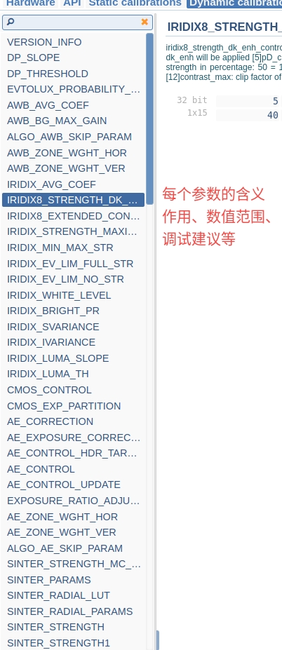 关于tuning tool界面中 Static Calibrations 和 Dynamic Calibrations 这两个模块的tuning参数,有没有专门的文档详细介绍它们的含义、作用、数值范围、调试建议。目前我这边的文档并不全面,有些IQ参数解释较简单,有些参数则在文档中直接找不到。