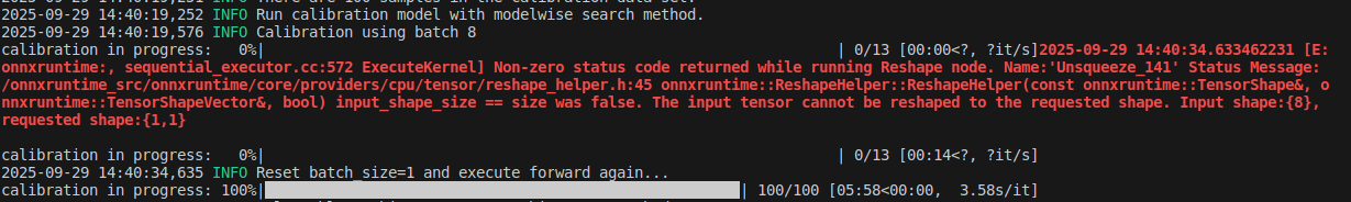 2025-09-29 15:48:29.742275802 [E:onnxruntime:, sequential_executor.cc:572 ExecuteKernel] Non-zero status code returned while running Reshape node. Name:'Unsqueeze_141' Status Message: /onnxruntime_src/onnxruntime/core/providers/cpu/tensor/reshape_helper.h:45 onnxruntime::ReshapeHelper::ReshapeHelper(const onnxruntime::TensorShape&, onnxruntime::TensorShapeVector&, bool) input_shape_size == size was false. The input tensor cannot be reshaped to the requested shape. Input shape:{8}, requested shape:{1,1}