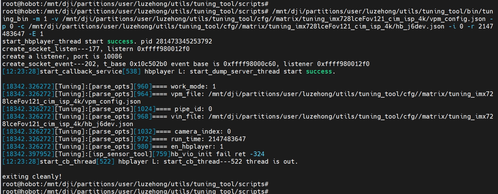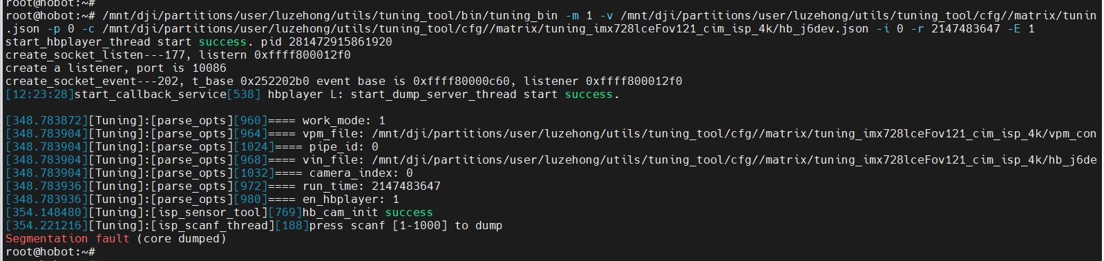 root@hobot:~# /app/utils/tuning_tool/bin/tuning_bin start_hbplayer_thread start success. pid 281472981922208 create_socket_listen---175, create failed listern (nil) create_socket_listen---179, listern 0xffff840012d0 create a listener, port is 10087 create_socket_event---204, t_base 0xc2602b0 event base is 0xffff84000c30, listener 0xffff840012d0 [426412.867584]start_callback_service[538] hbplayer L: start_dump_server_thread start success. [426412.867584][Tuning]:[print_usage][1433]Usage: /app/utils/tuning_tool/bin/tuning_bin -m work mode 0: ISP_TOOL 1: ISP_FB_TOOL -v vpm_config path -c cam_config path -p pipe_id -M dual_sensor -i camera_index -r run time for isp tool (second) -l loop count for feedback mode -E enable hobotplayer -b enable get ae info -B enable set ae info -z enable get context -Z enable set context -D input path -o output path -y get yuv after ynr -Y enable ynr debug -F raw-format 1:raw8 2:raw12 3:raw16 -d dump count brfore scanf -q codec quality factor -e enable codec -h usage help