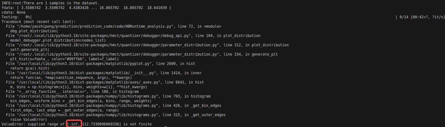 操作:在做算子敏感度分析时,绘制分布曲线“”dbg.plot_distribution“” ,数值出现 “-inf” ,导致绘制失败。