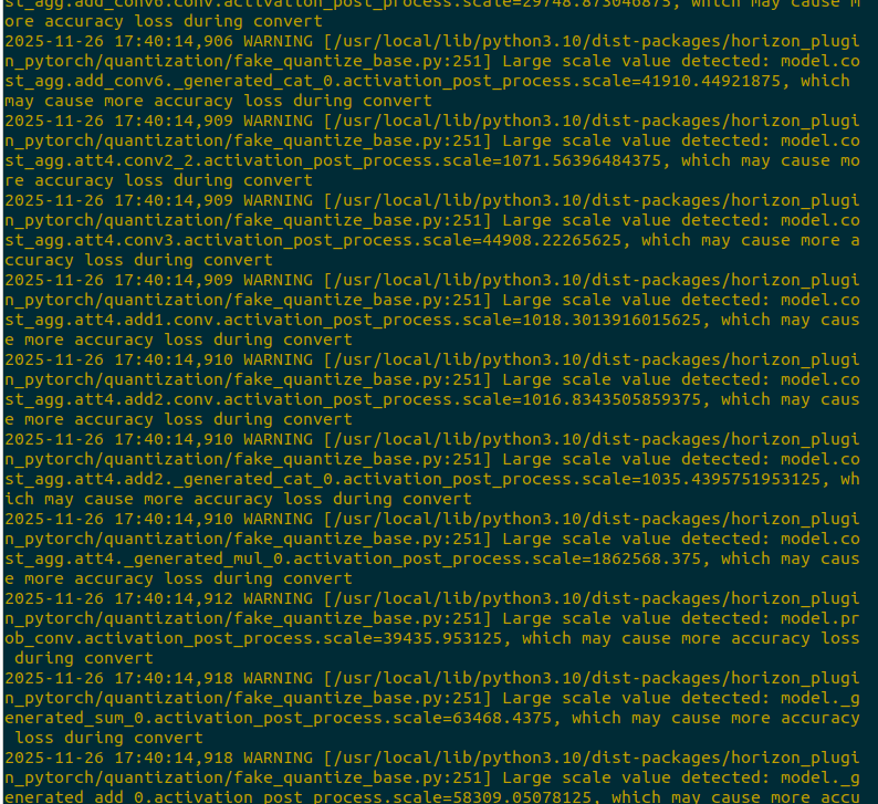 Large scale value detected: model.cost_agg.att4.add2.conv.activation_post_process.scale=1102.5093994140625, which may cause more accuracy loss during convert;,可能会导致精度损失,怎么解决,会导致Loss下降的慢,以及最终的hbm模型精度不好吗?